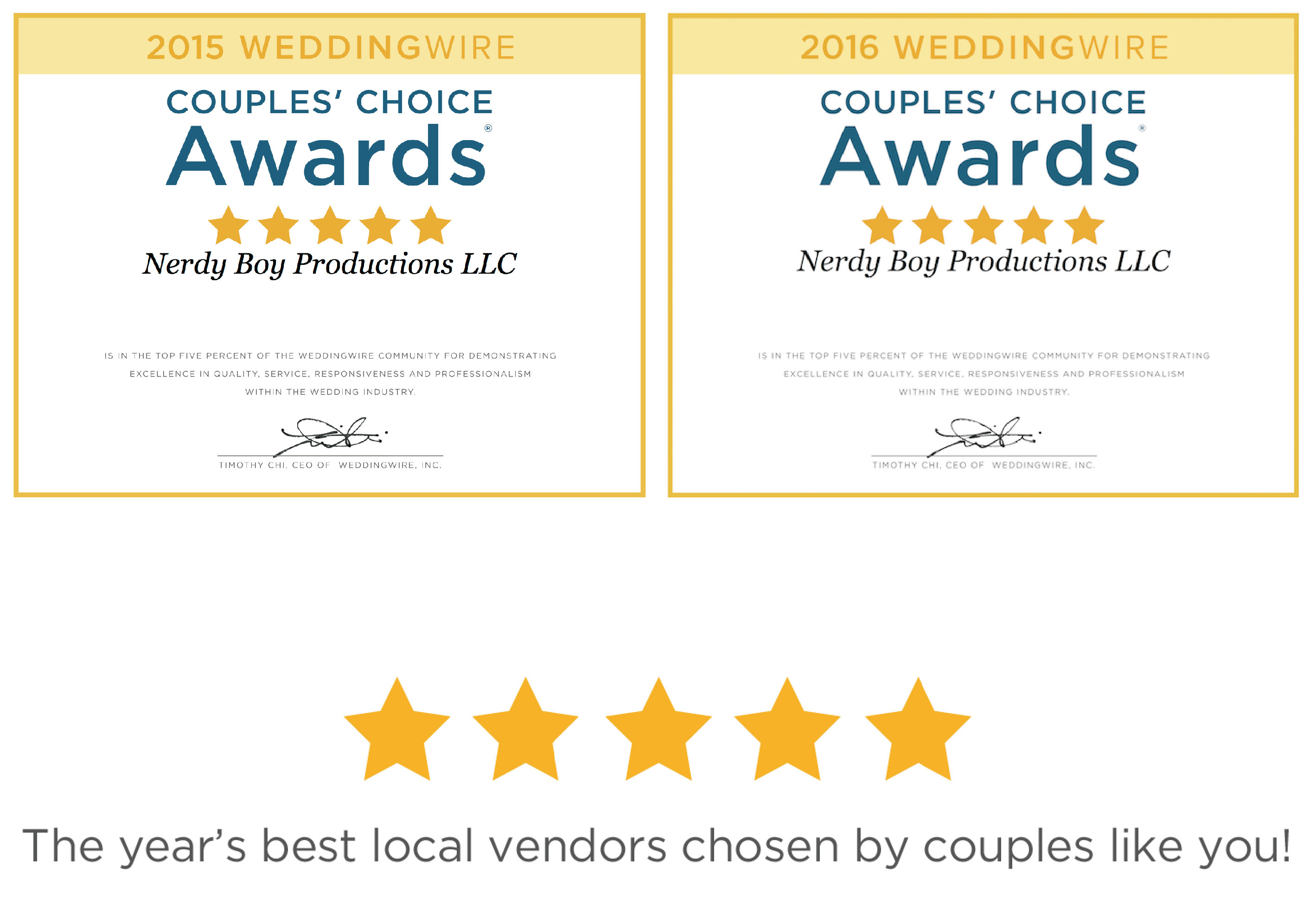 Nerdy Boy Productions LLC is committed to consistently offering an outstanding experience. Our talents allow us to facilitate the planning of your wedding, to help you choose the most appropriate music, to coordinate the schedule, and of course to DJ on the day! In addition we can take your wedding to the next level with unbelievable lighting. Breathtaking examples of our event lighting expertise can be seen on our YouTube channel. Our utmost goal is to make sure that your wedding and reception are successful; we have the expertise to make this happen!